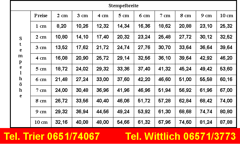 Die Preise errechnen Sie anhand folgender Preisliste. Suchen Sie den Preis in der Spalte Stempelbreite mit entsprechender Stempelhöhe in entsprechender Zeile. Preis zzgl. Fracht und ges. Mwst.